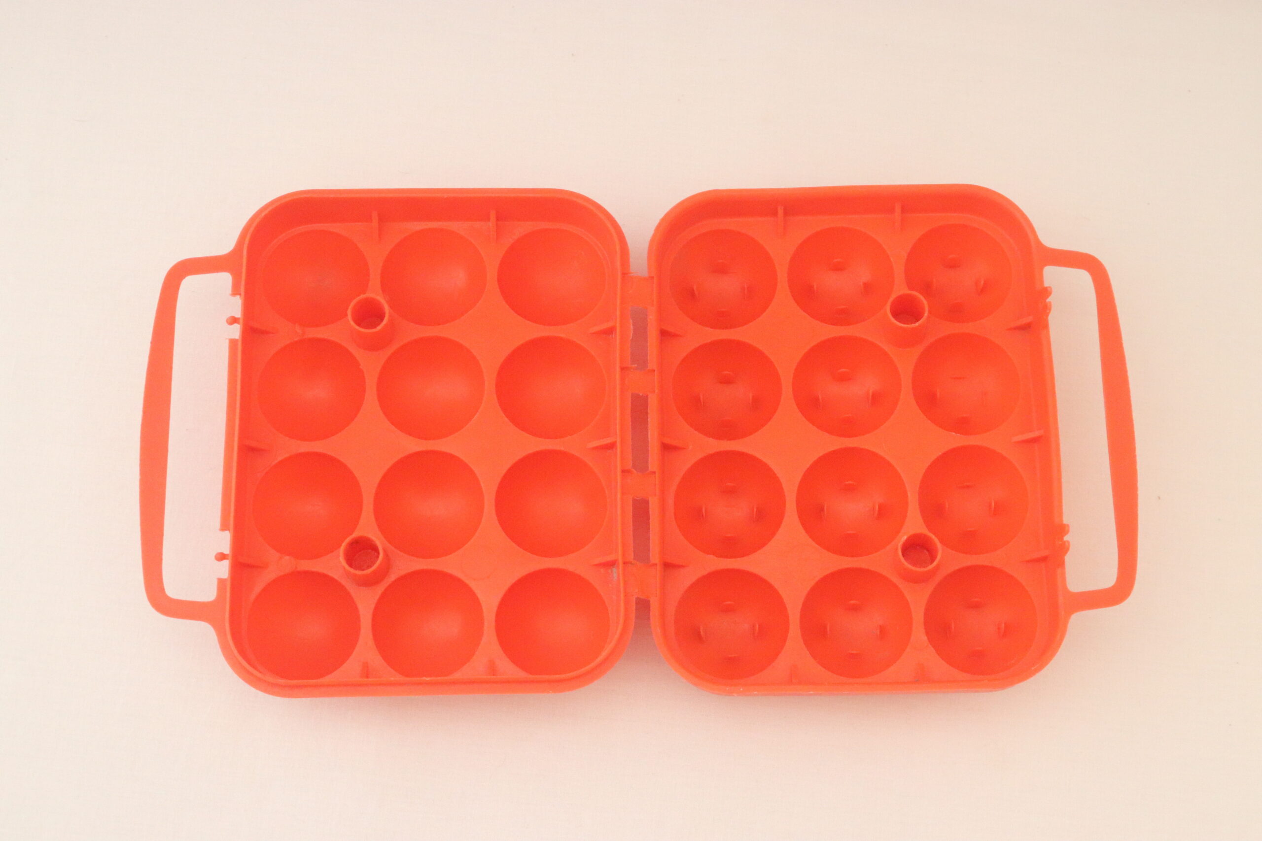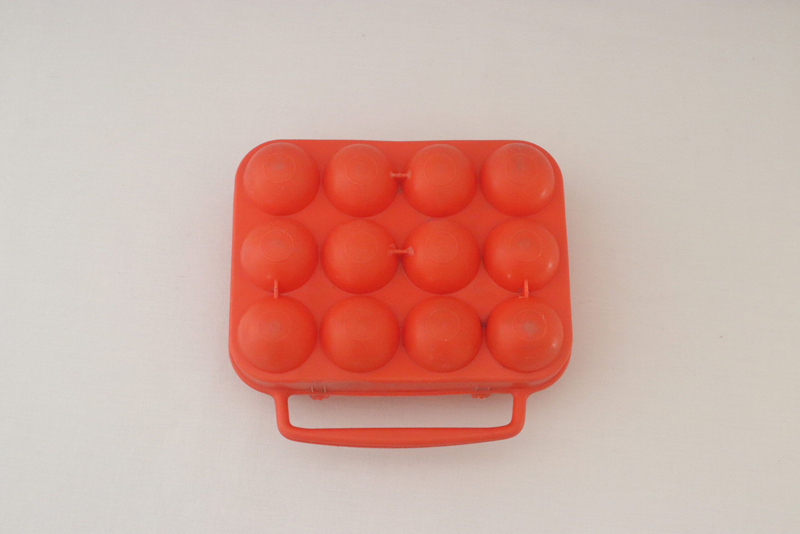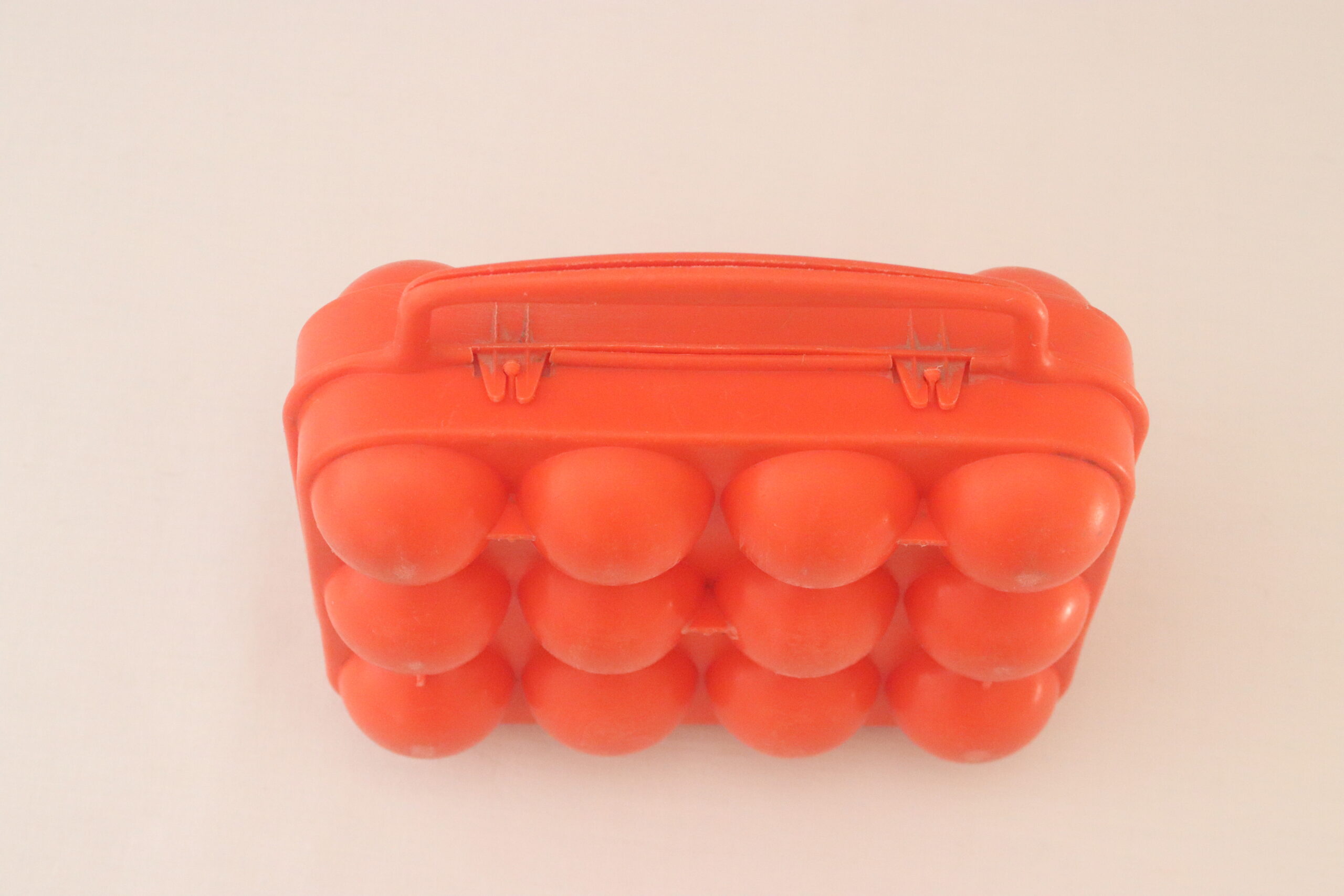 Cette boîte à œufs est en plastique de couleur orange, la anse est fine, le fermoir est de style « agrafe ». Elle peut contenir 12 œufs de calibre moyen.