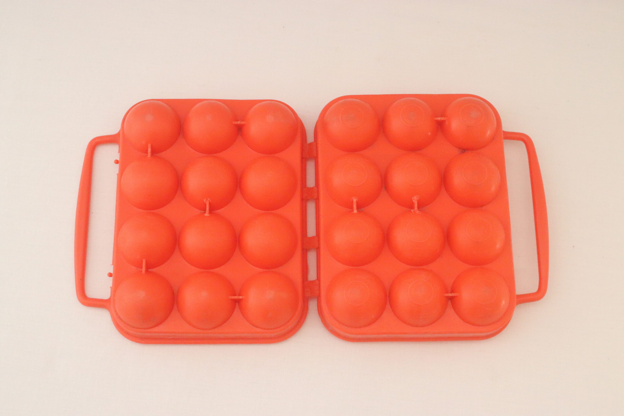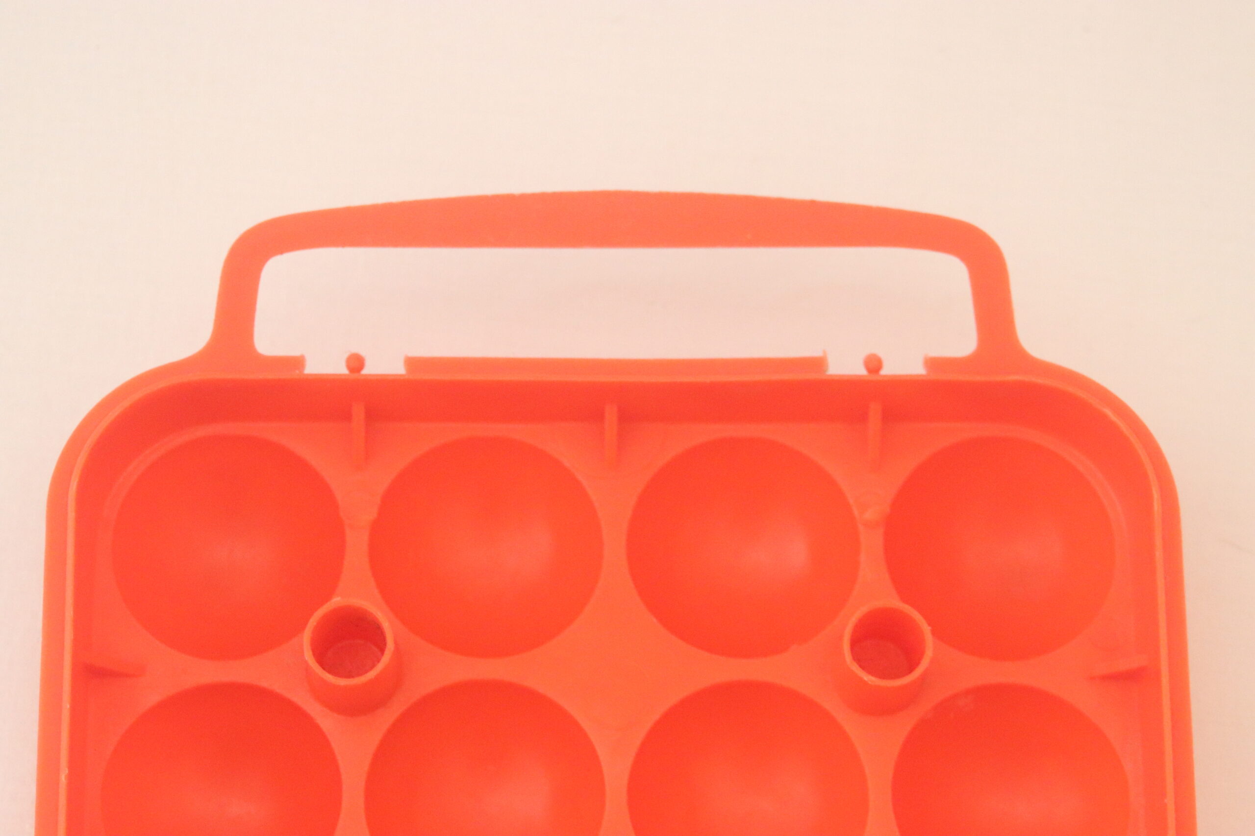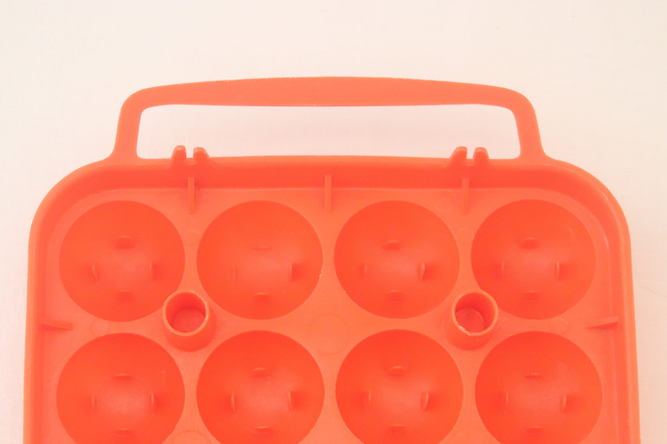 Cette boîte à œufs est en plastique de couleur orange, la anse est fine, le fermoir est de style « agrafe ». Elle peut contenir 12 œufs de calibre moyen.