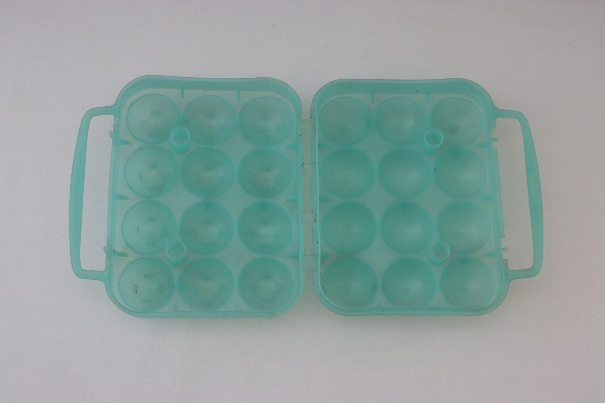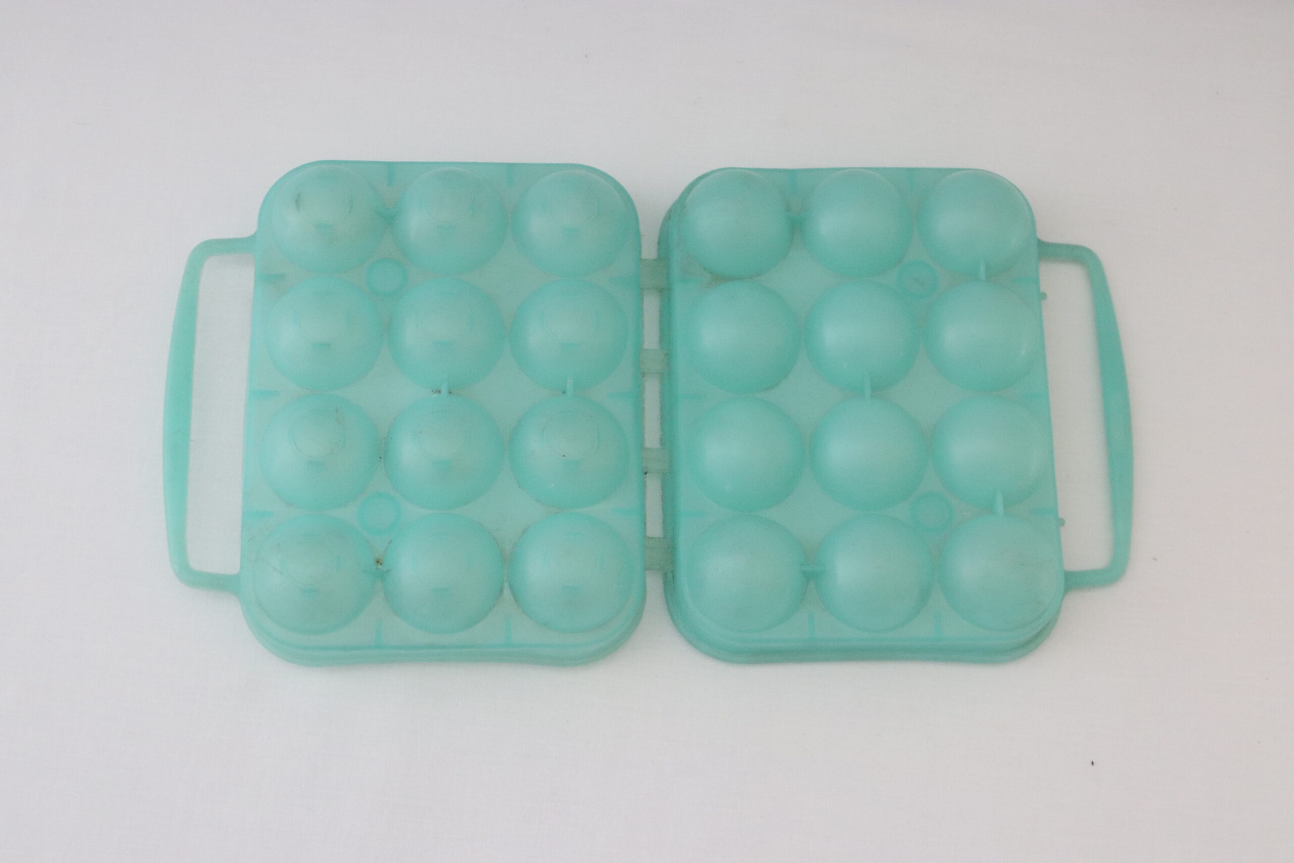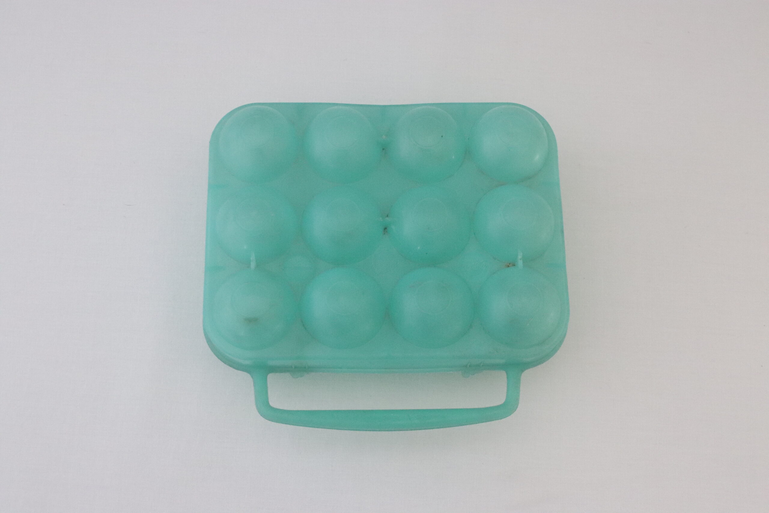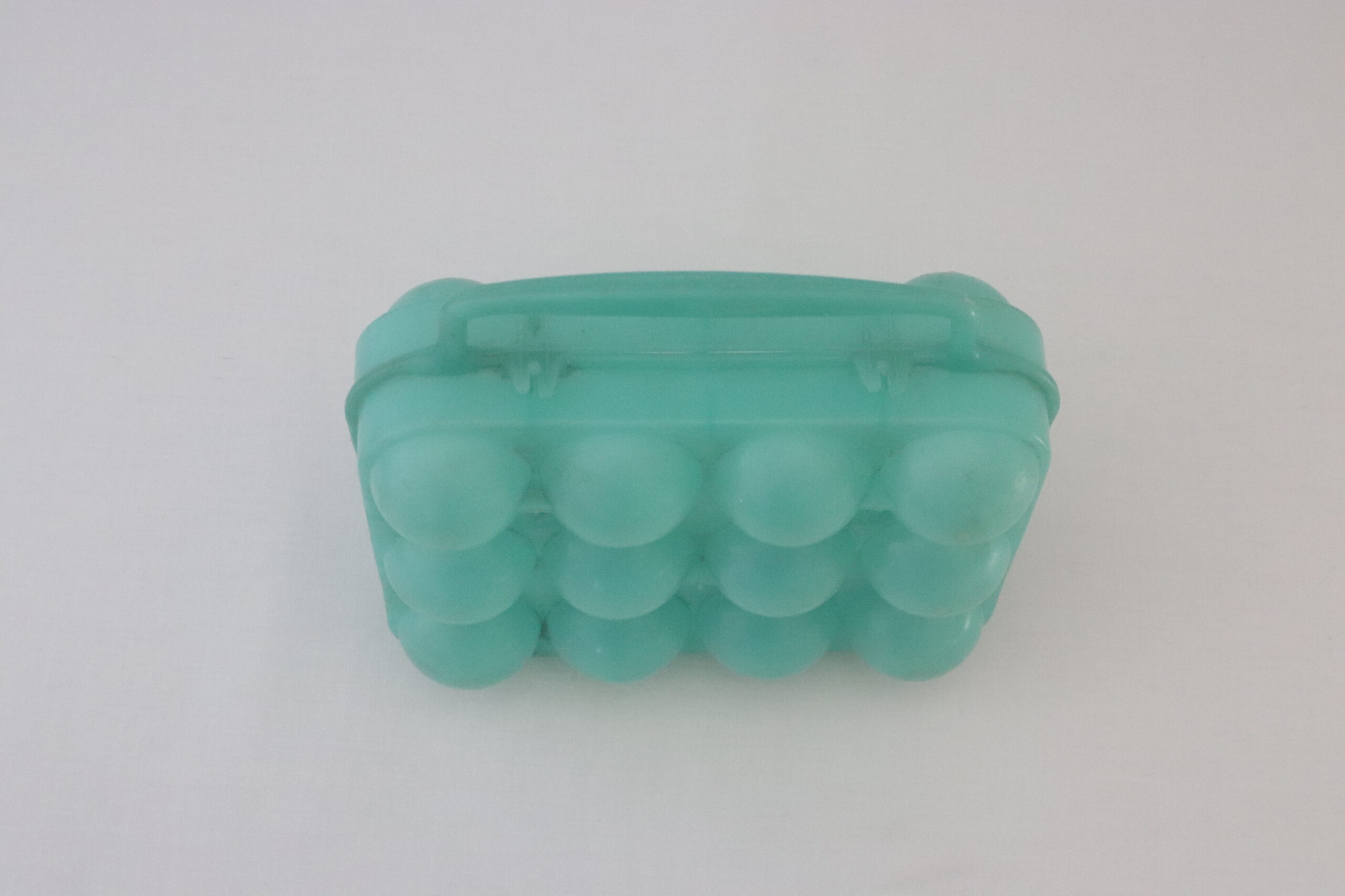 Cette boîte à œufs est en plastique de couleur verte, la anse est fine, le fermoir est de style « agrafe ». Elle peut contenir 12 œufs de calibre moyen.